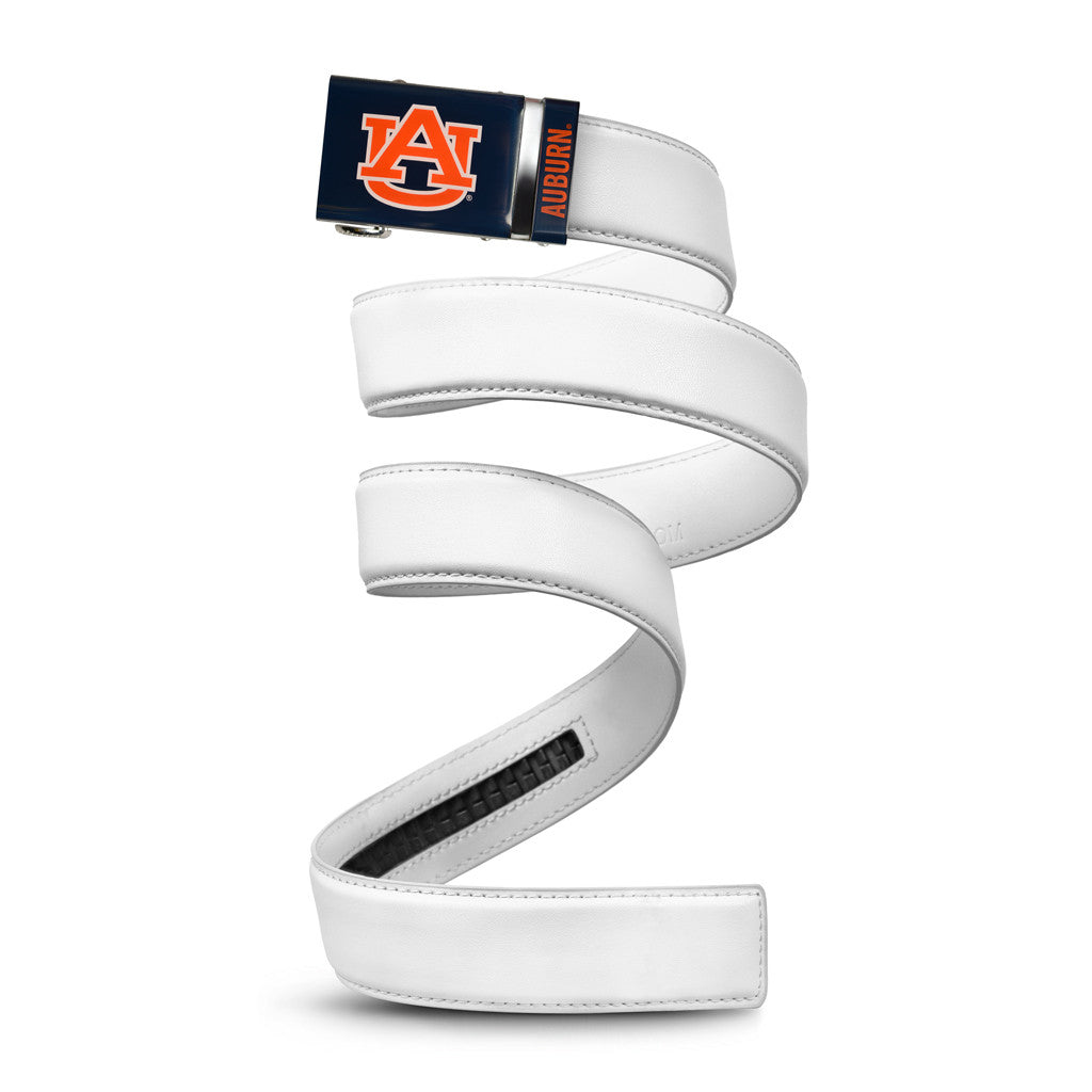 The officially licensed Auburn Tigers Belt features an imprinted team logo and team name on the buckle under a clear acrylic finish. Genuine leather strap with protective coating and the interior houses a special track which is part of the unique no-holes perfect fit system. The buckle can be detached from the leather strap so you can always trim it down to size.