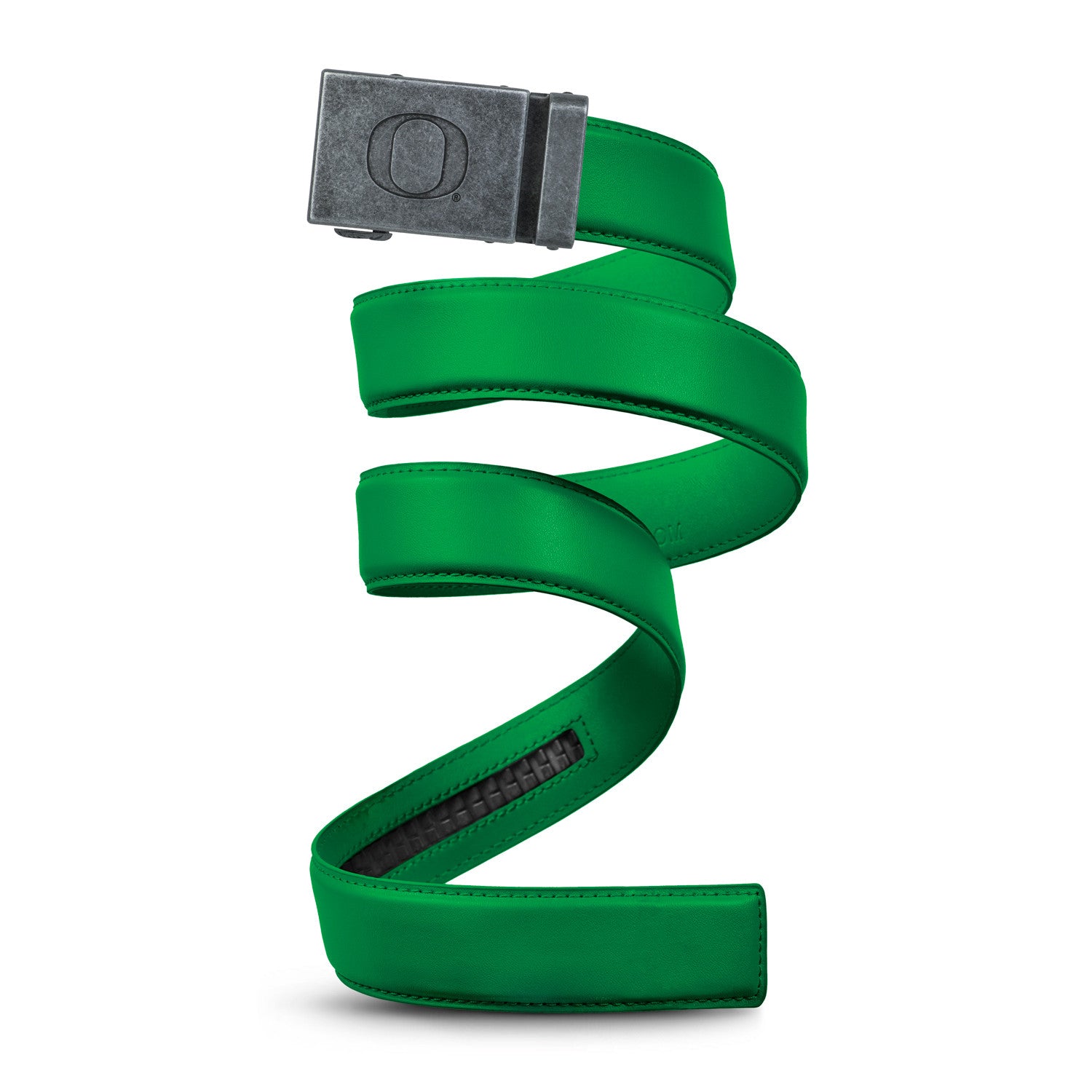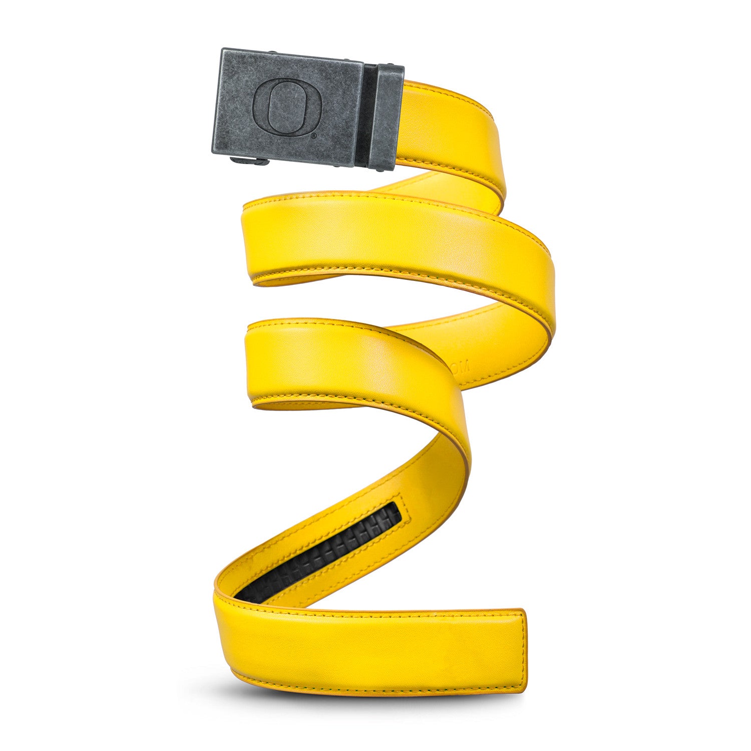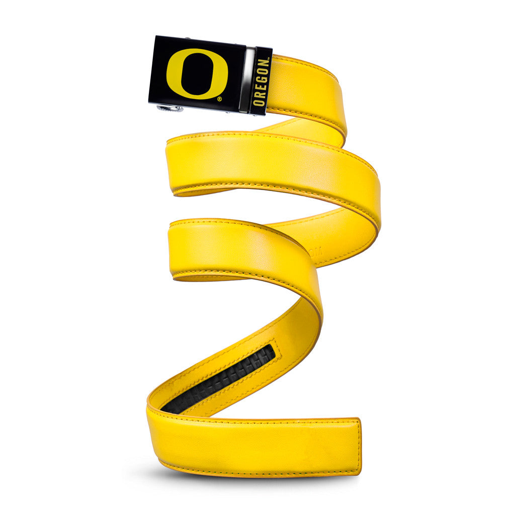 The officially licensed Oregon Ducks (Black) Belt features an imprinted team logo and team name on the buckle under a clear acrylic finish. Genuine leather strap with protective coating and the interior houses a special track which is part of the unique no-holes perfect fit system. The buckle can be detached from the leather strap so you can always trim it down to size.