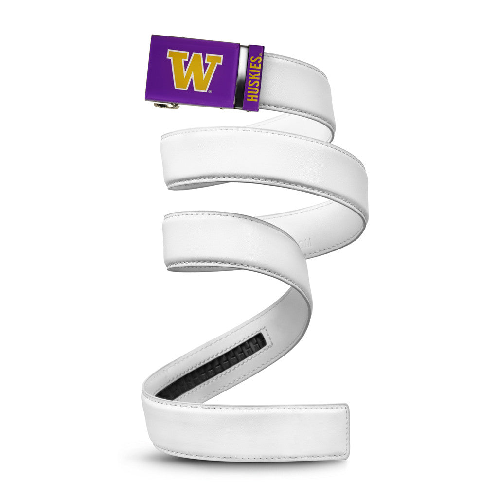 The officially licensed Washington Huskies Belt features an imprinted team logo and team name on the buckle under a clear acrylic finish. Genuine leather strap with protective coating and the interior houses a special track which is part of the unique no-holes perfect fit system. The buckle can be detached from the leather strap so you can always trim it down to size.