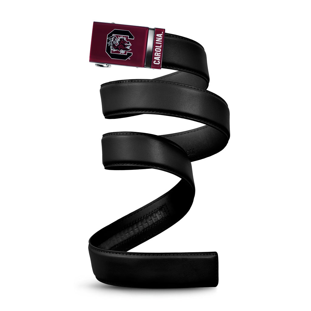 The officially licensed South Carolina Gamecocks Belt features an imprinted team logo and team name on the buckle under a clear acrylic finish. Genuine leather strap with protective coating and the interior houses a special track which is part of the unique no-holes perfect fit system. The buckle can be detached from the leather strap so you can always trim it down to size.