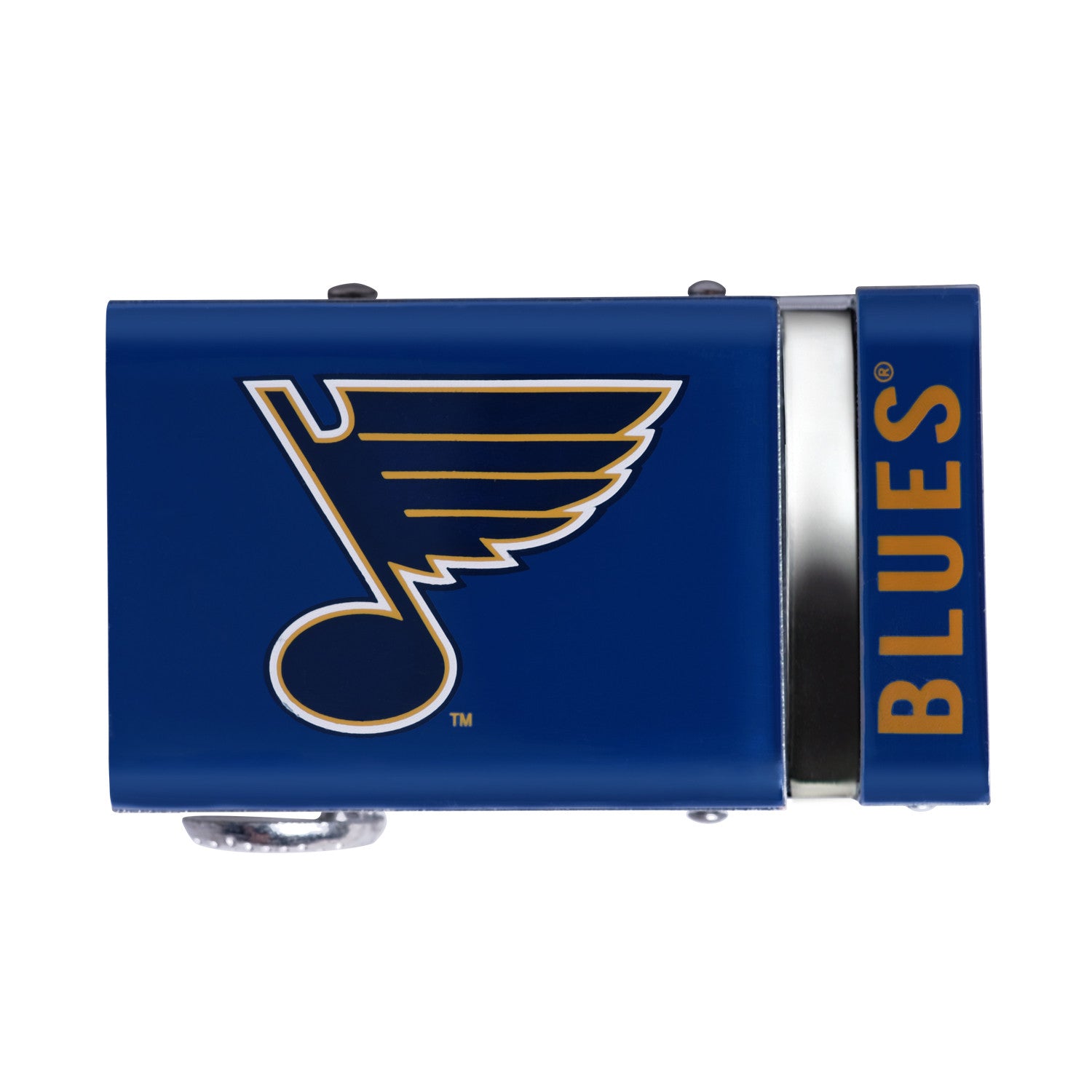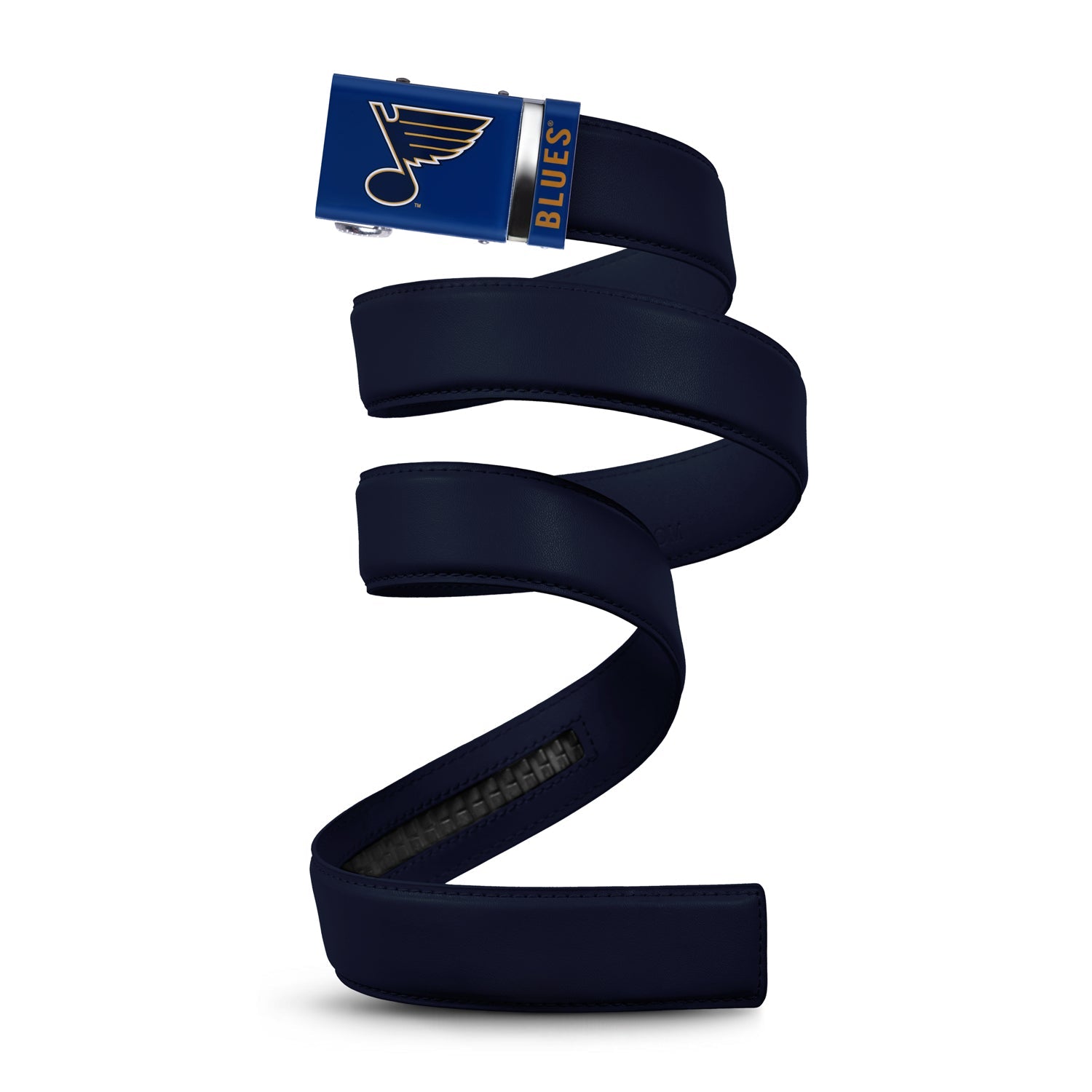 The officially licensed St. Louis Blues Belt from Mission Belt Co. features an imprinted team logo and team name on the buckle under a clear acrylic finish. Genuine leather strap with protective coating and the interior houses a special track which is part of the unique no-holes perfect fit system. The buckle can be detached from the leather strap so you can always trim it down to size.